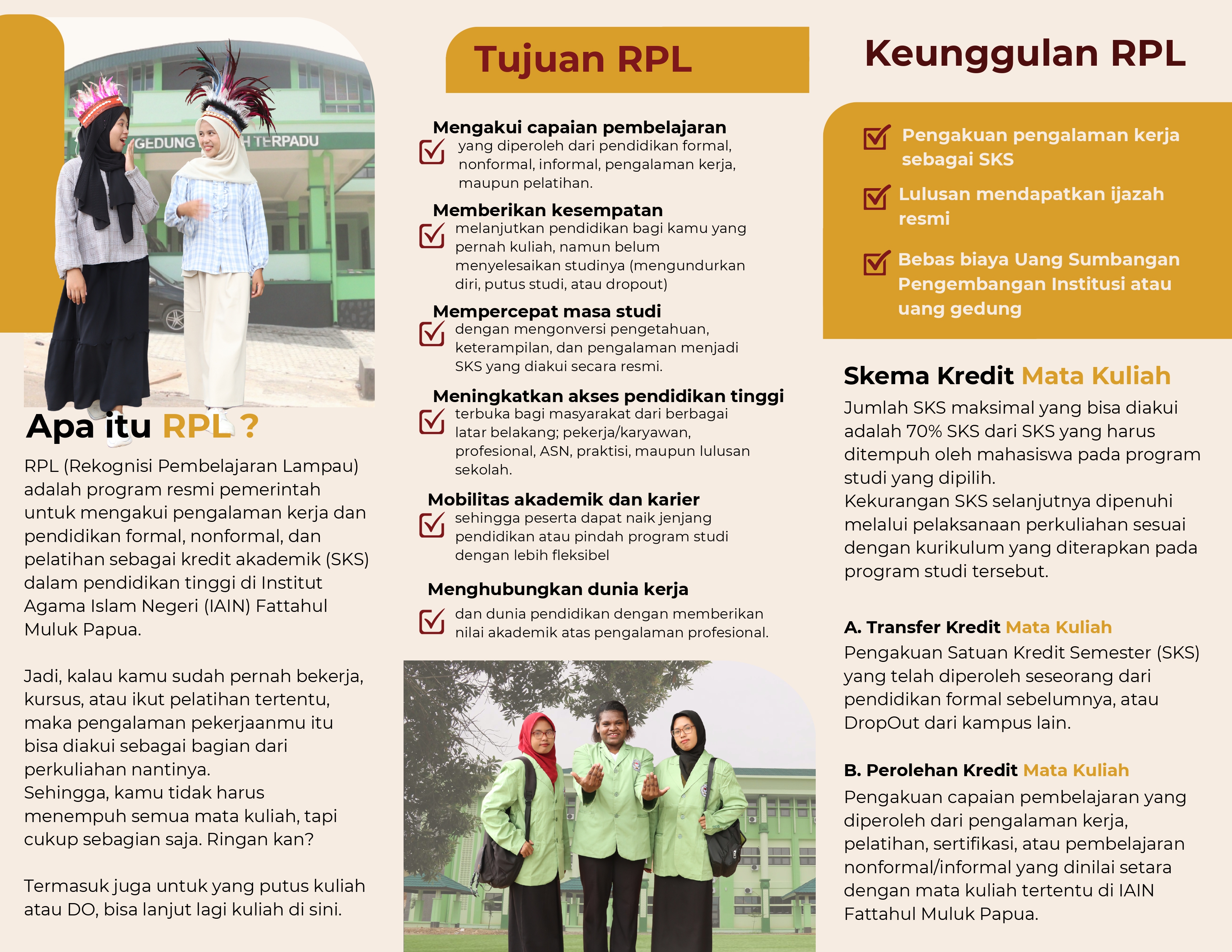 RPL adalah program istimewa yang memberikan pengakuan resmi atas pengalaman belajar dan kerja Anda, baik yang diperoleh dari pendidikan formal, nonformal, informal, maupun pengalaman dunia kerja, untuk diakui sebagai bagian dari pendidikan formal di jenjang S1 atau S2.